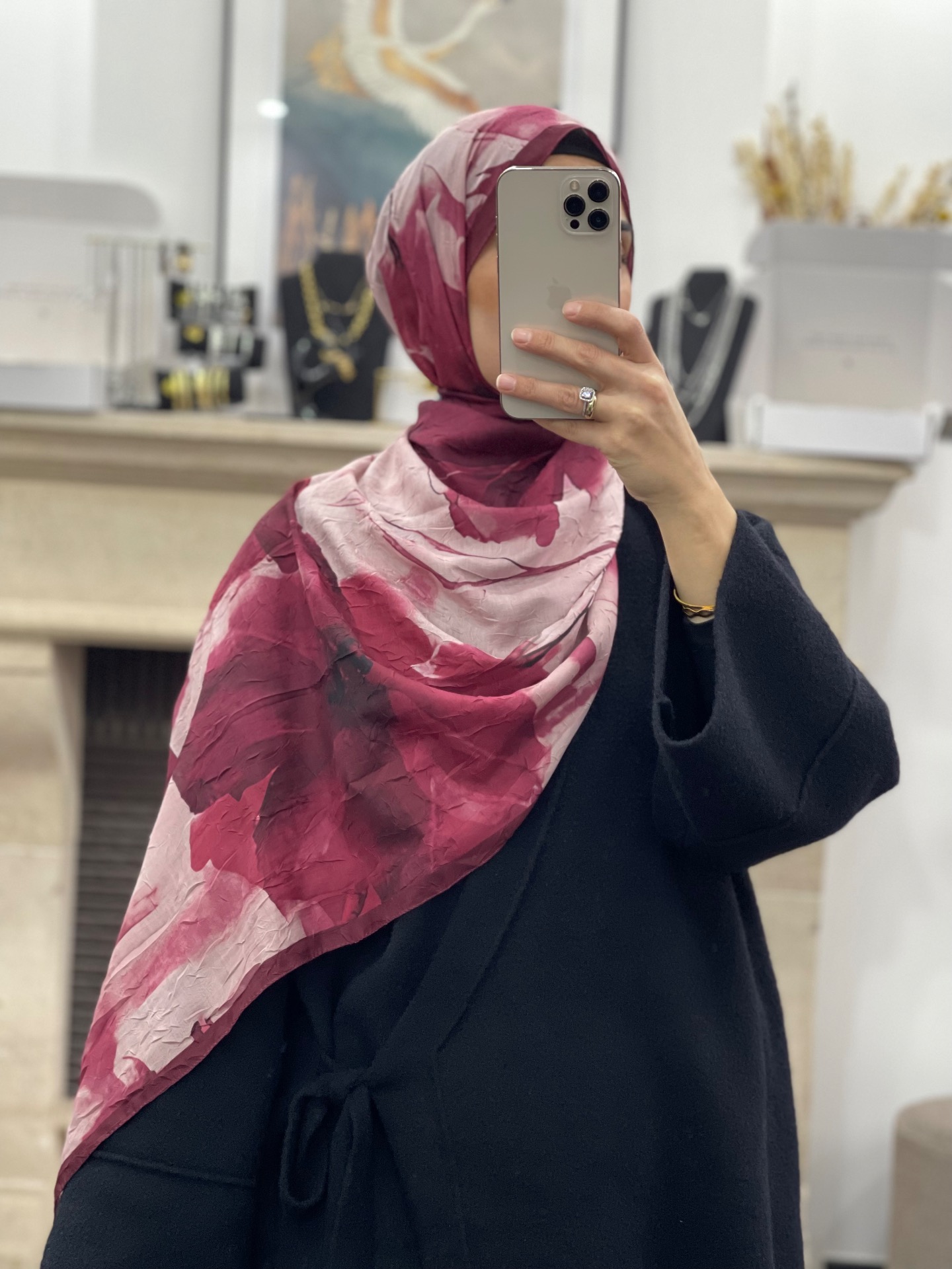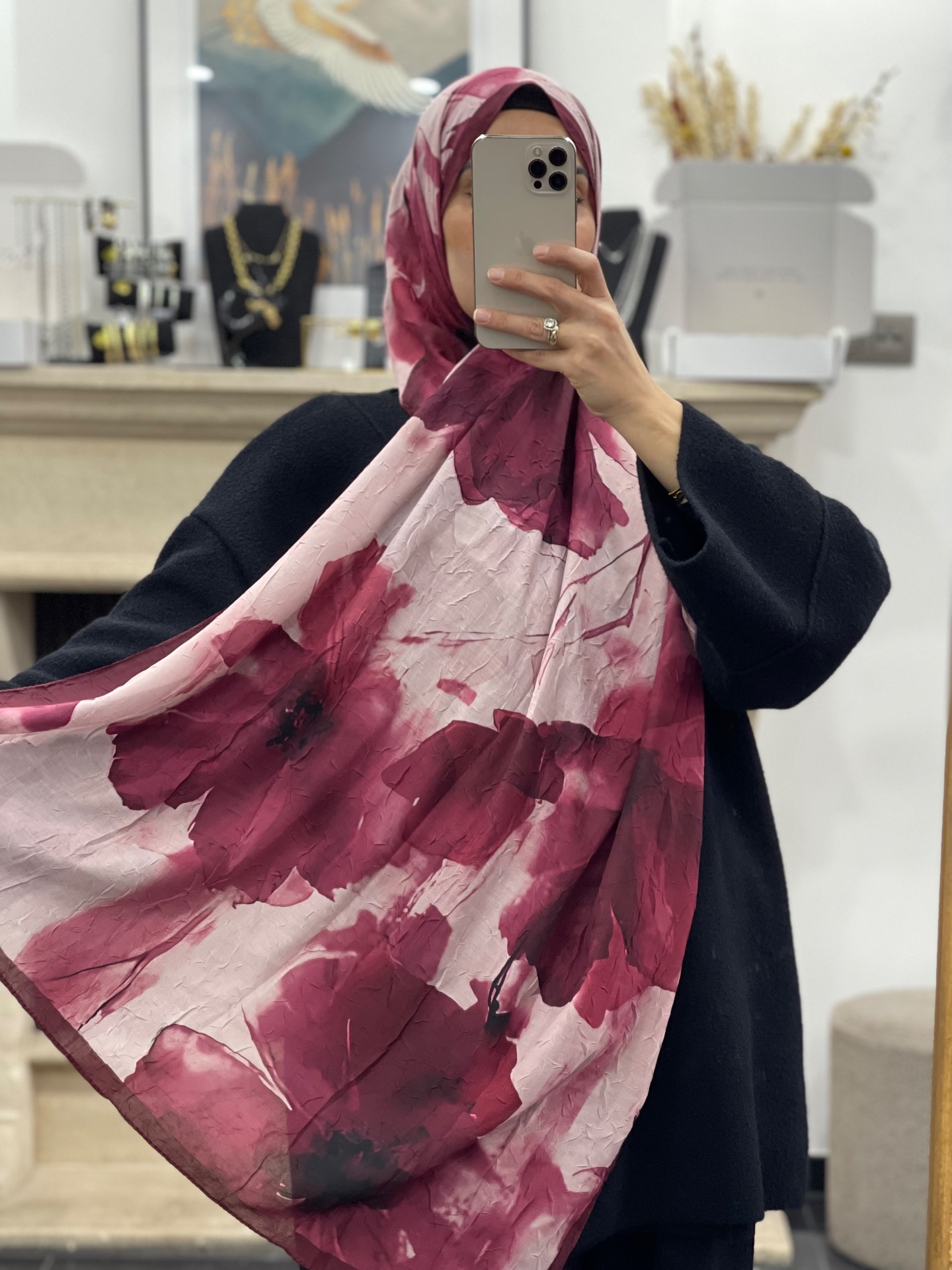 Bamboe Sjaal Hoofddoek Hijab met Grote Klaprozen Print Bordeaux-Roze