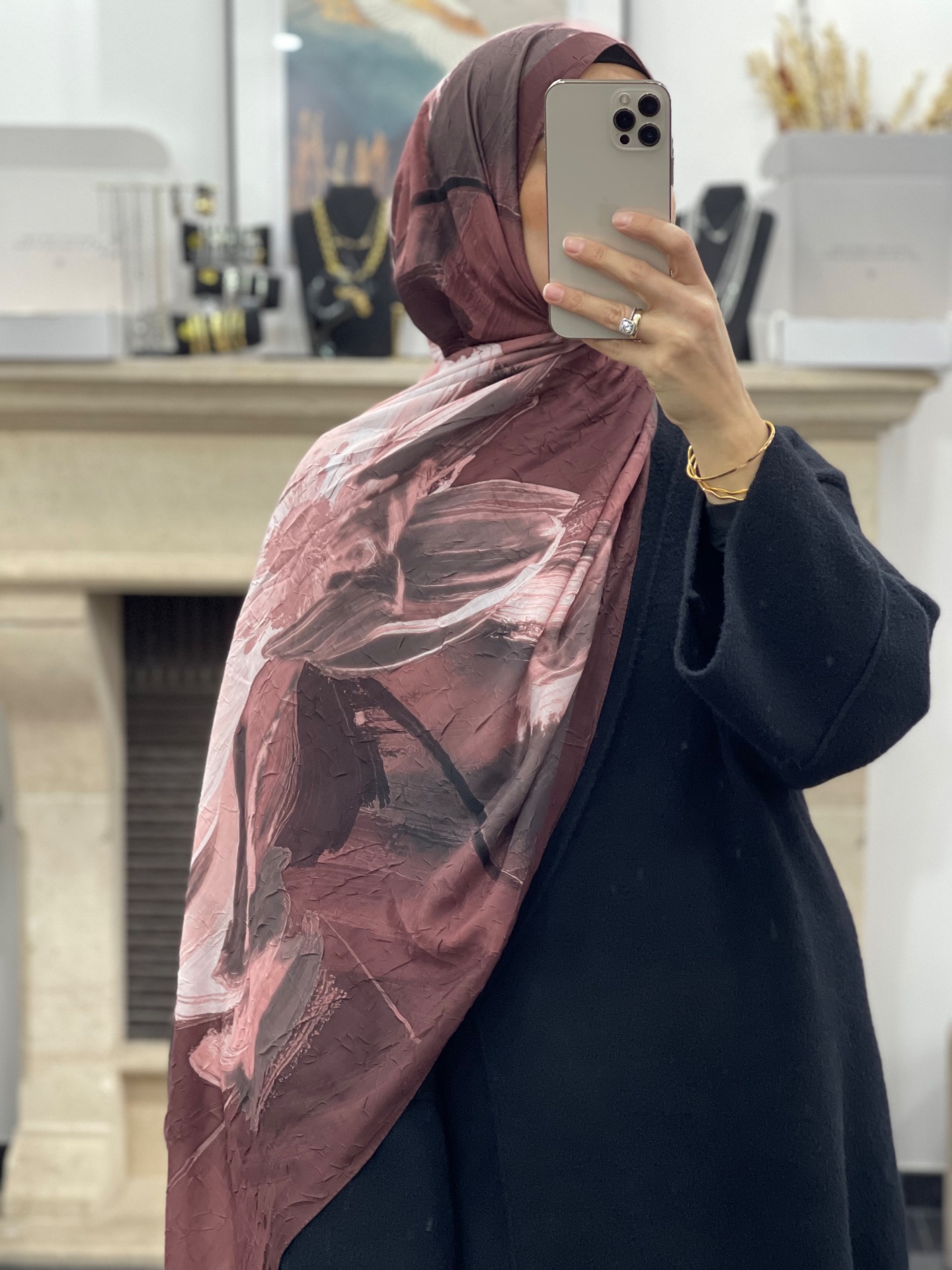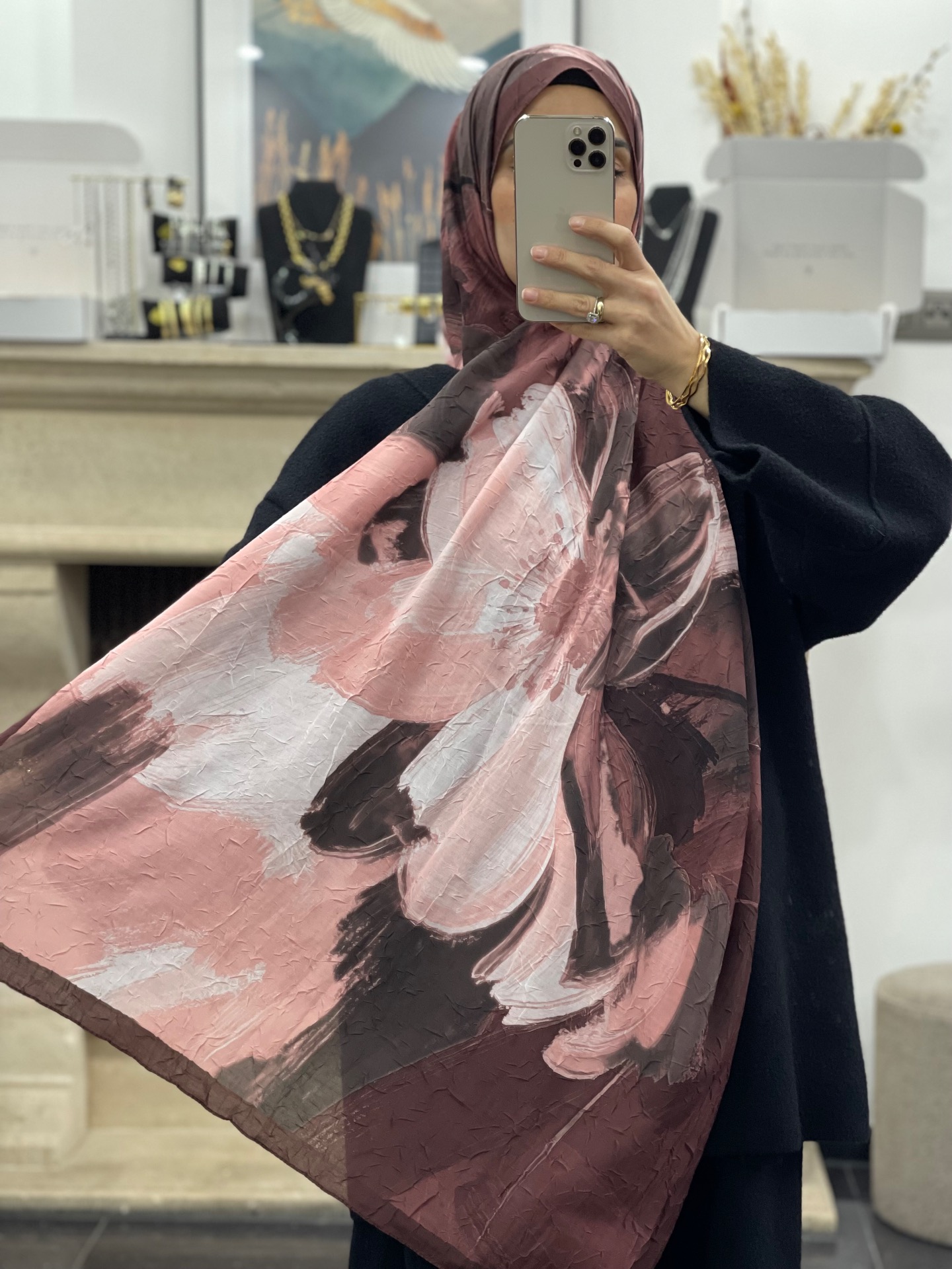 Bamboe Sjaal Hoofddoek Hijab met Geverfde Bloem Print Bordeaux-Roze
