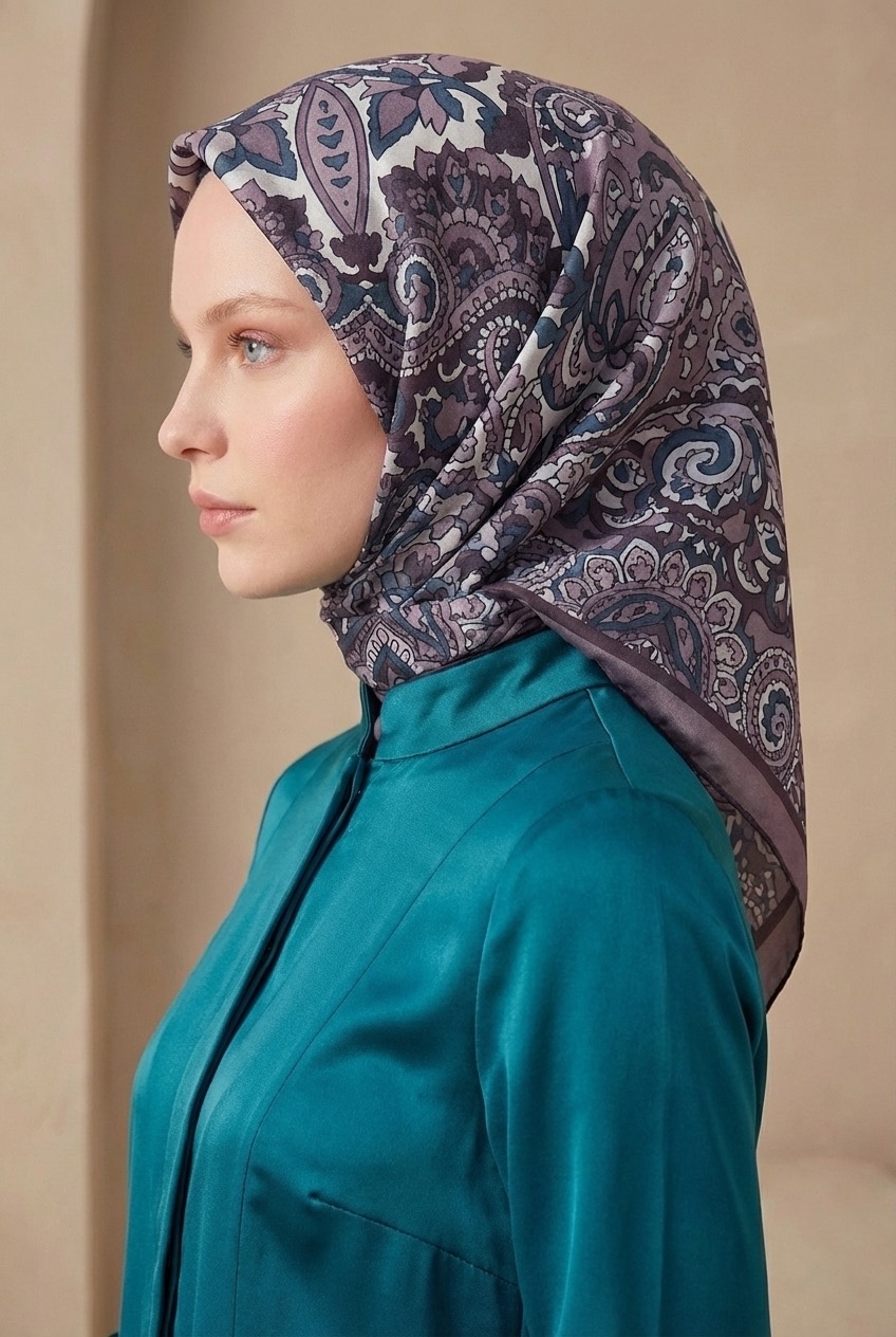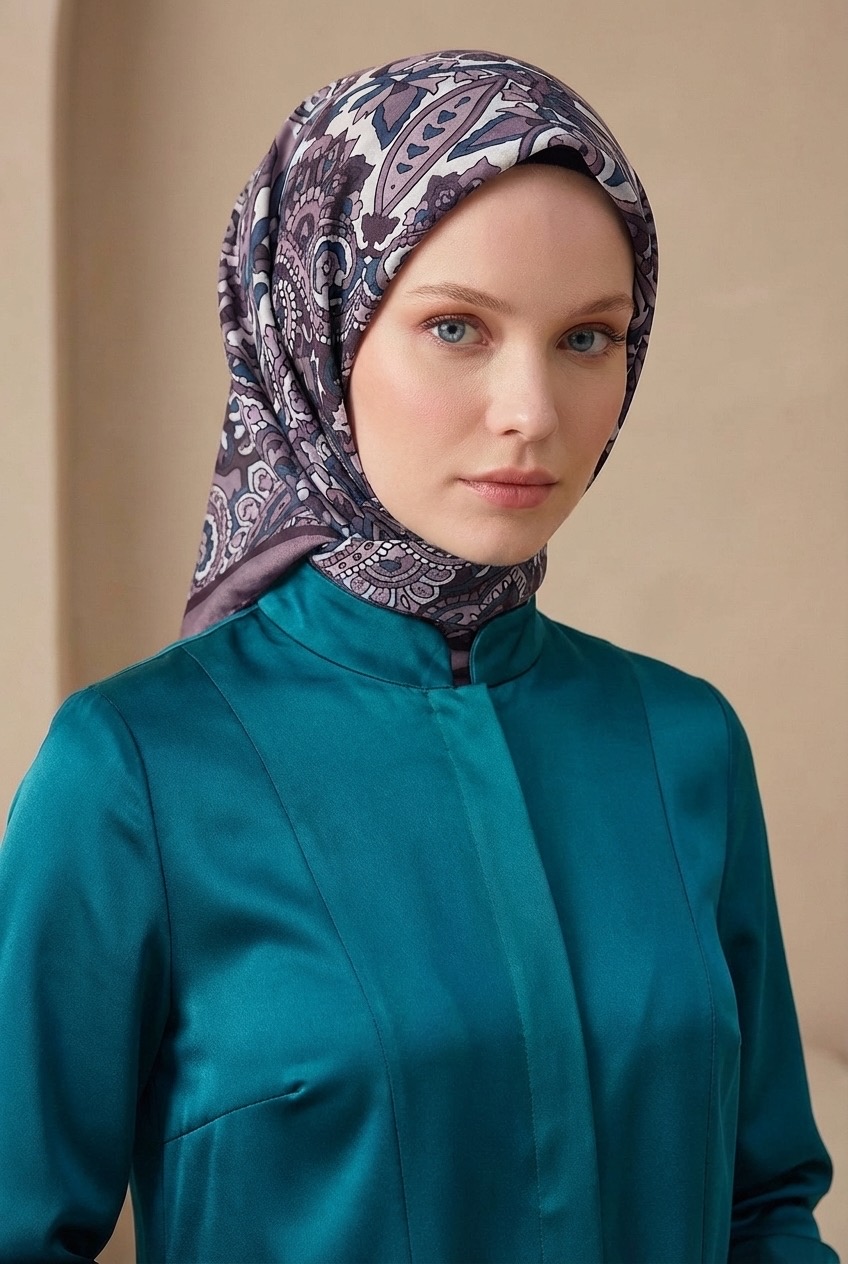 Hoofddoek Sjaal Hijab Soft Vierkant Met Print Paarsgrijs-Turquoise