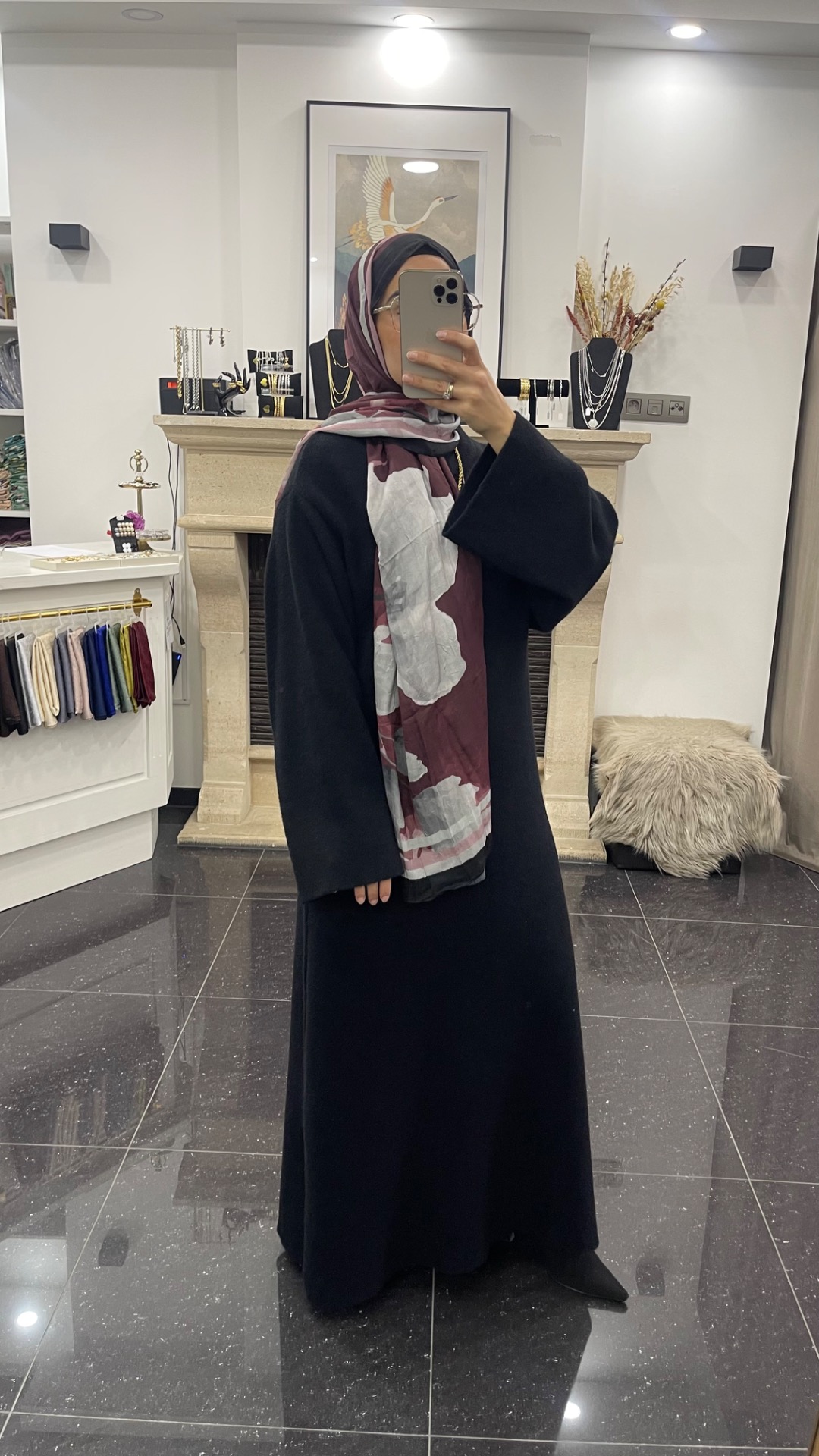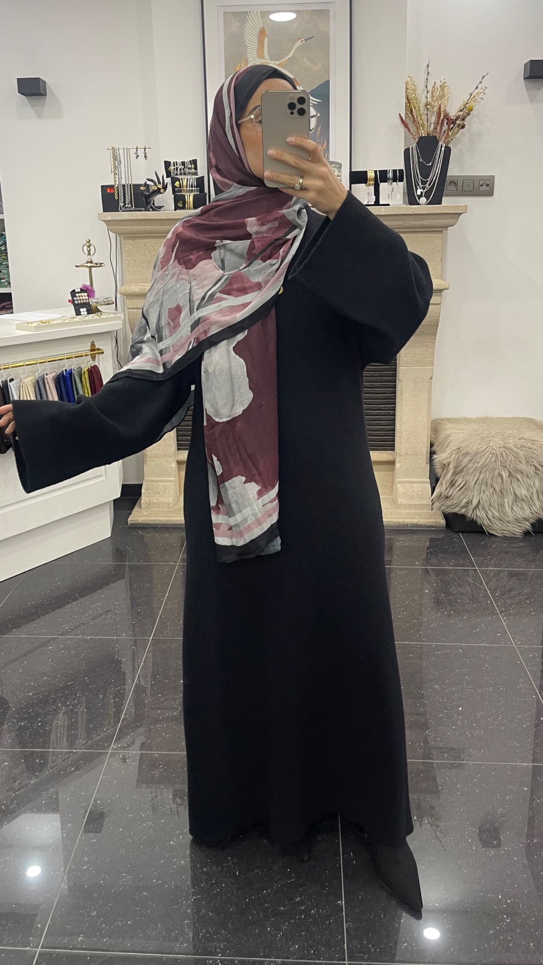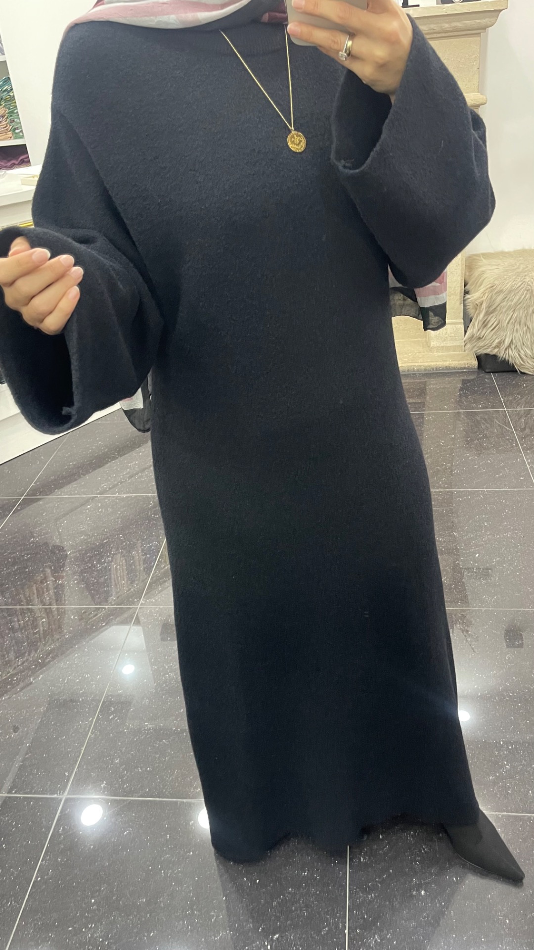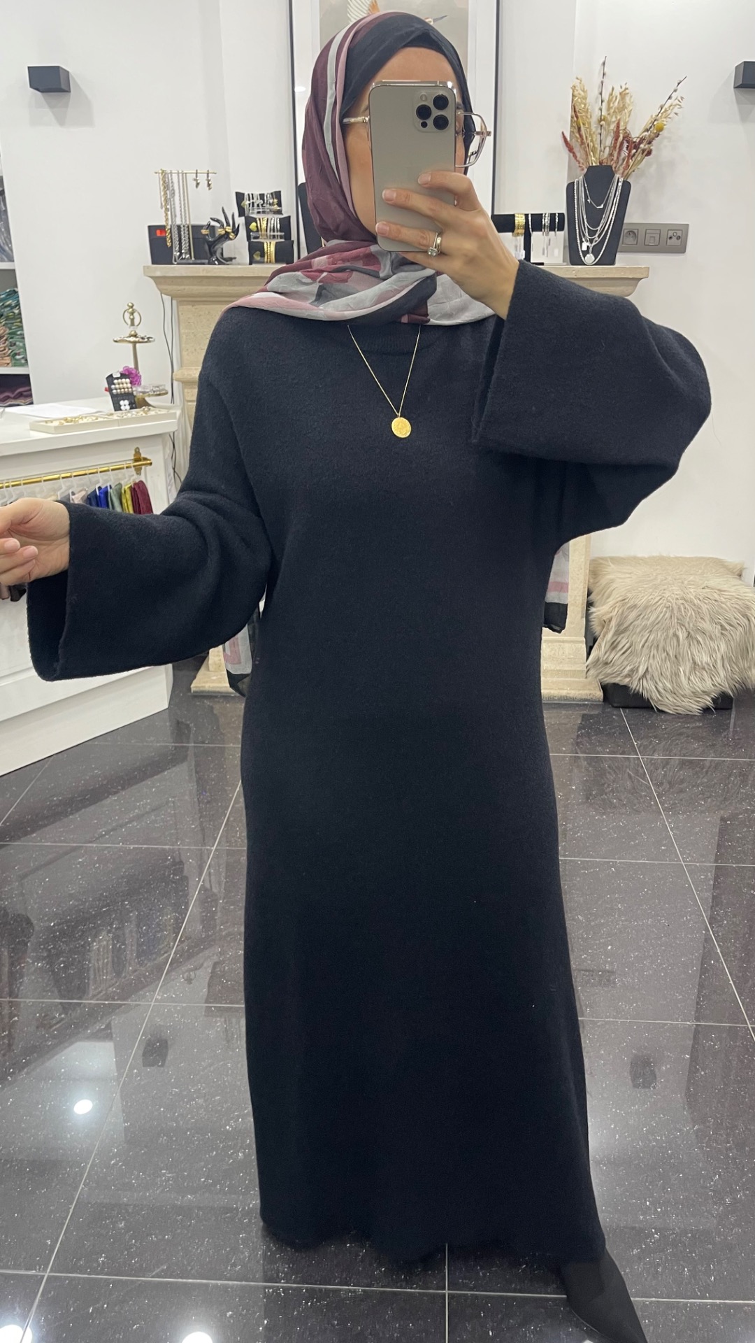 Warme rechte jurk met een ronde kraag en wijde mouwen. De jurk is gemaakt van vilten stof en kriebelt niet.