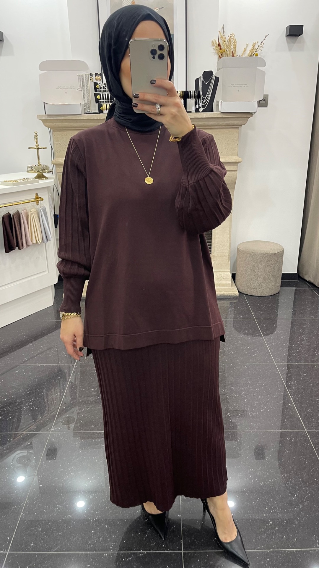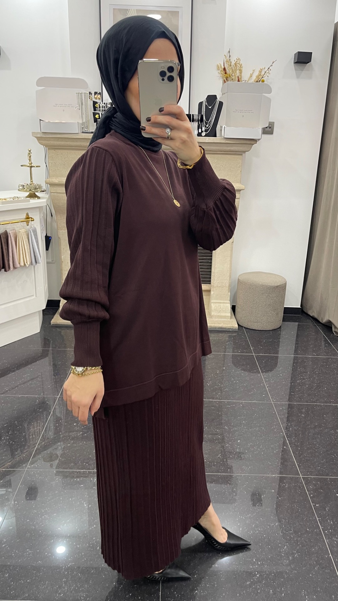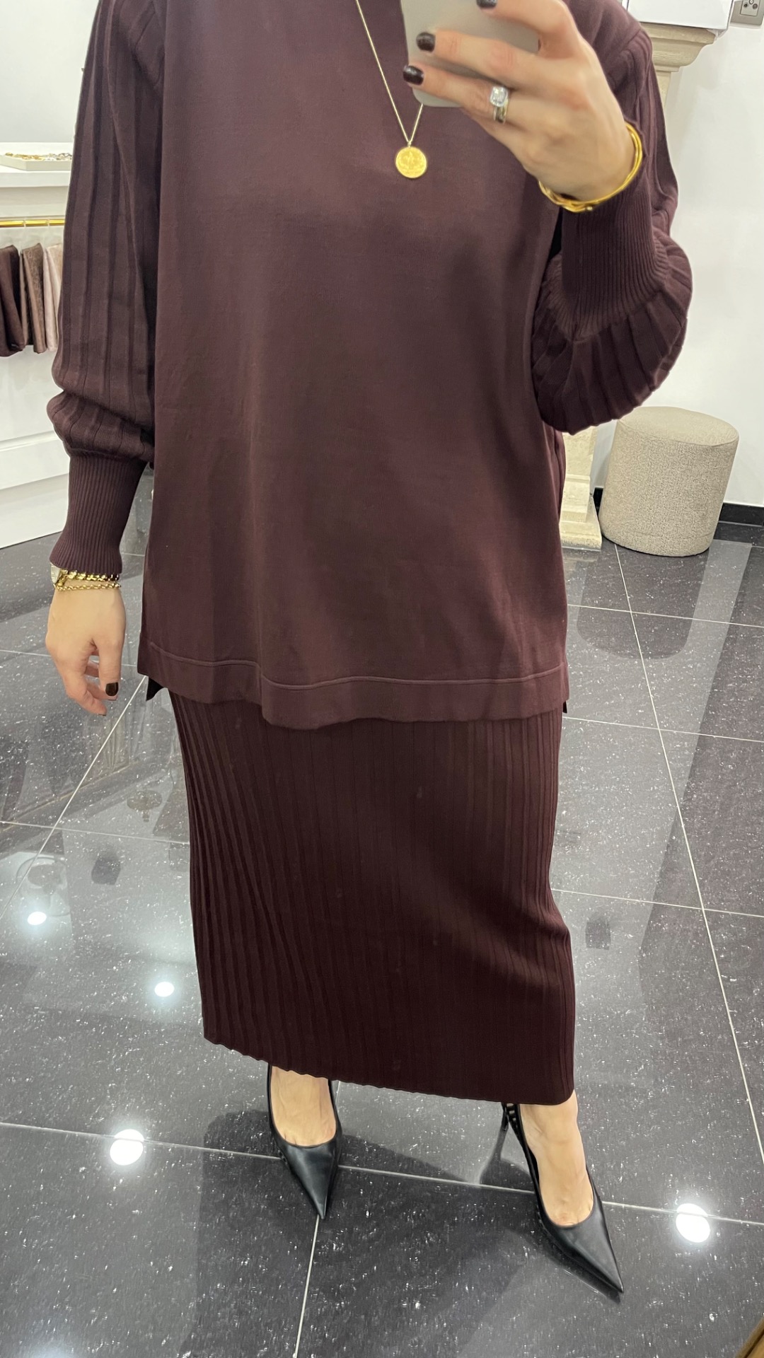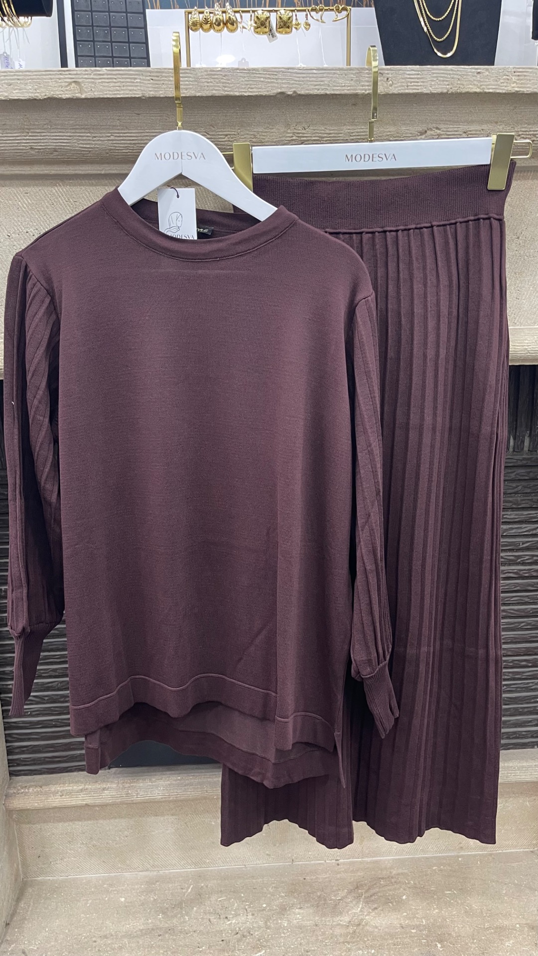 Ontdek de ultieme mix van stijl en comfort met onze merserizé tricot twinset met plissérok en blouse met plissémouwen in ballonmodel.