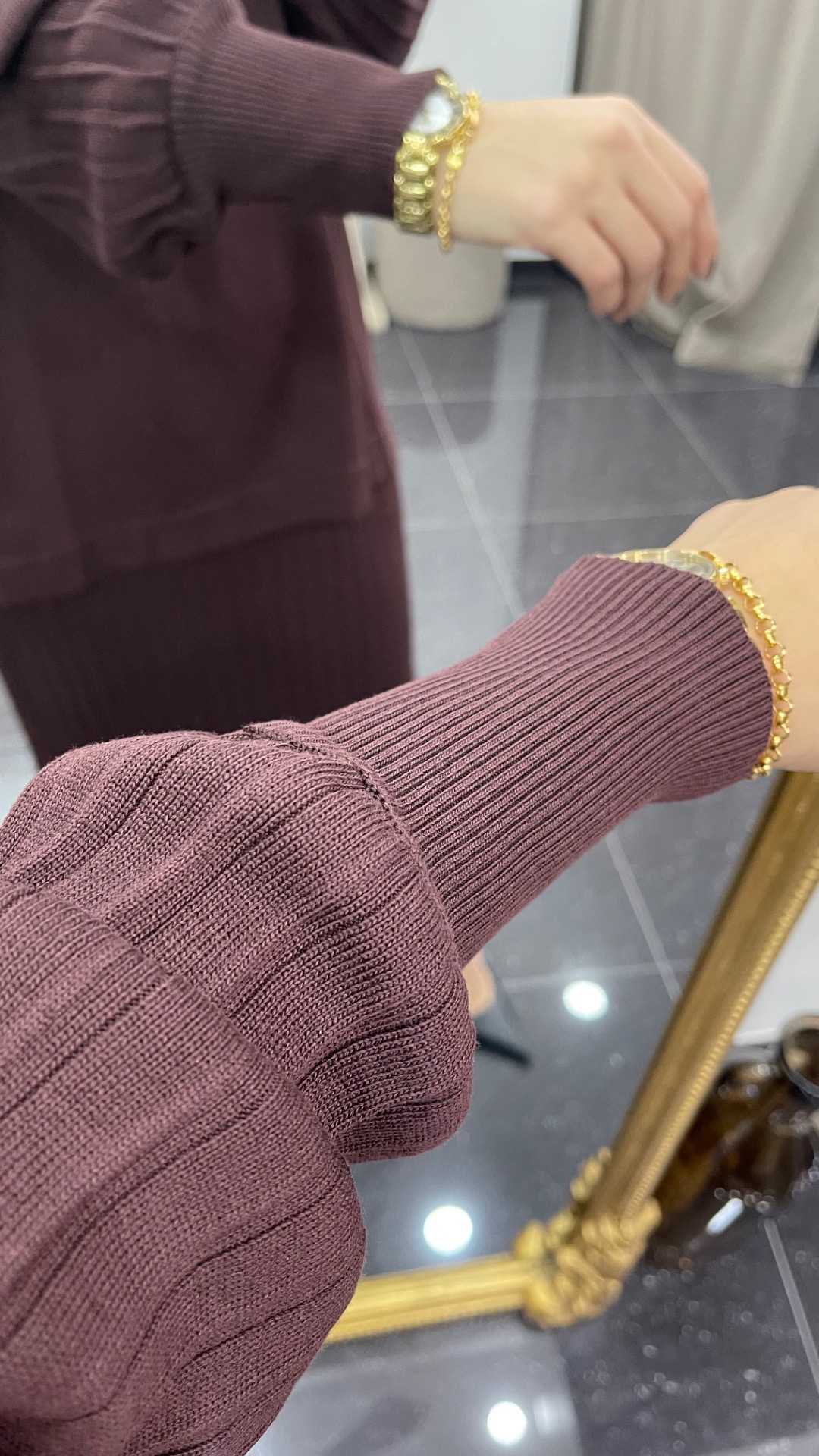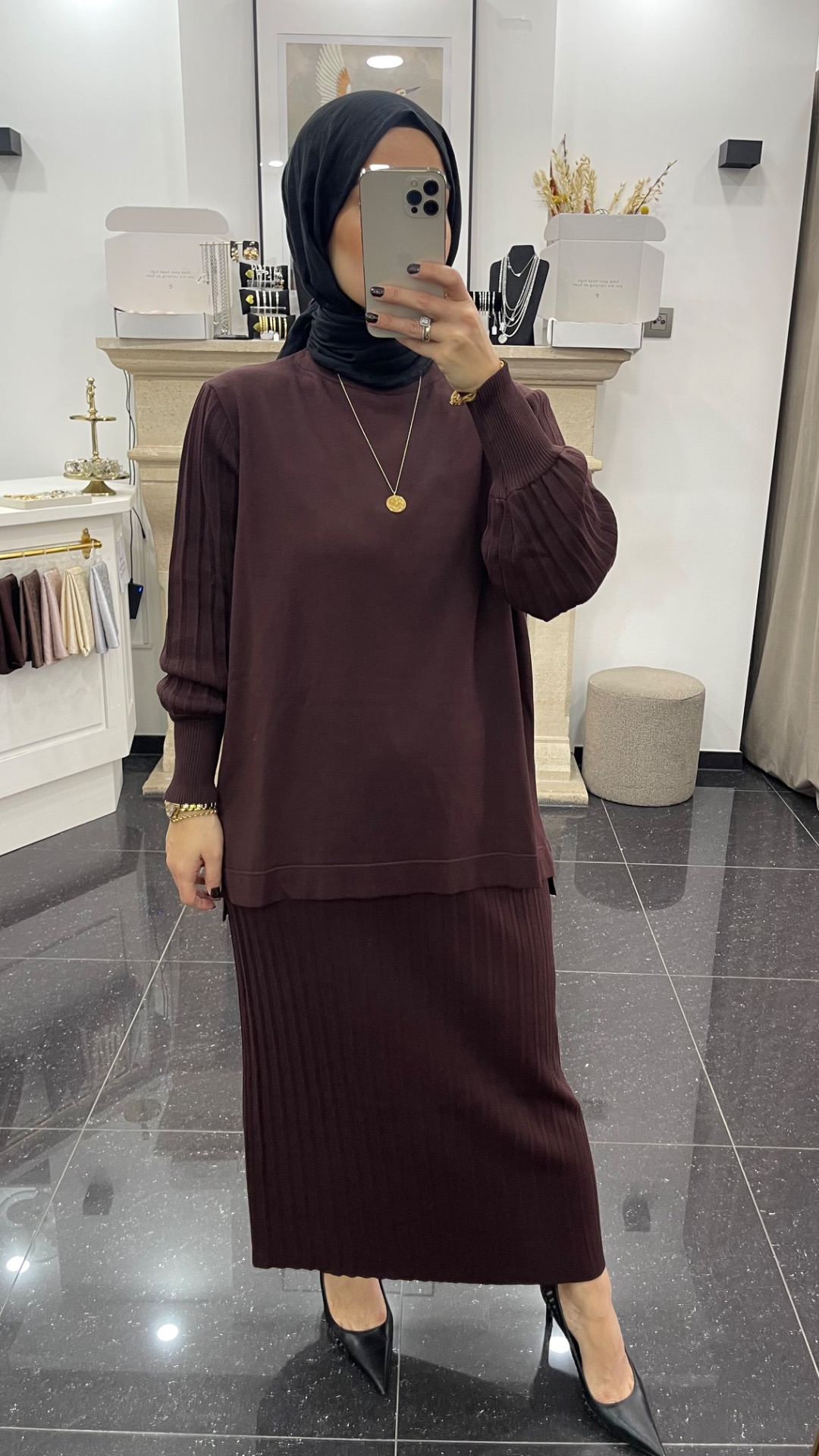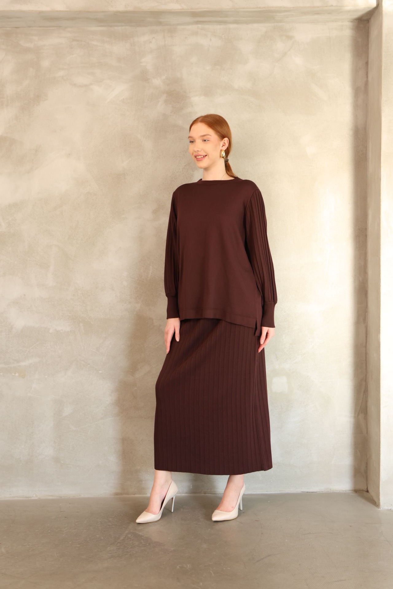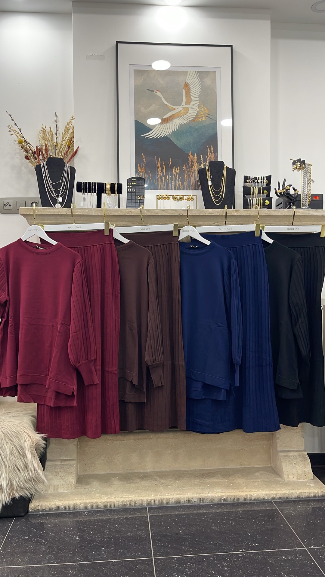 Ontdek de ultieme mix van stijl en comfort met onze merserizé tricot twinset met plissérok en blouse met plissémouwen in ballonmodel.