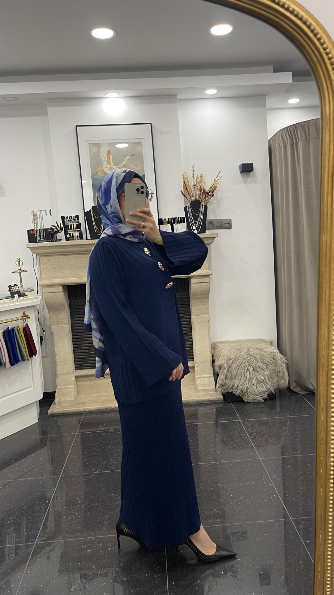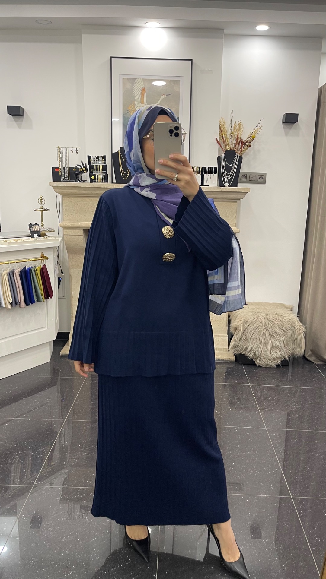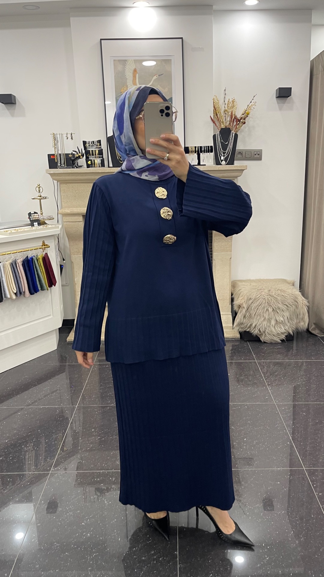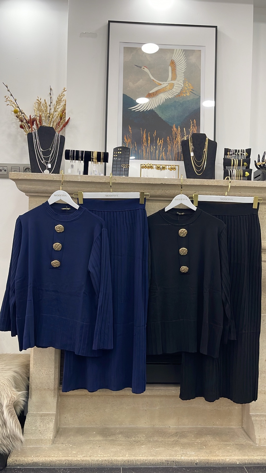 Mercerisé Tricot Twinset met plissérok en blouse met statement knopen - Donkerblauw