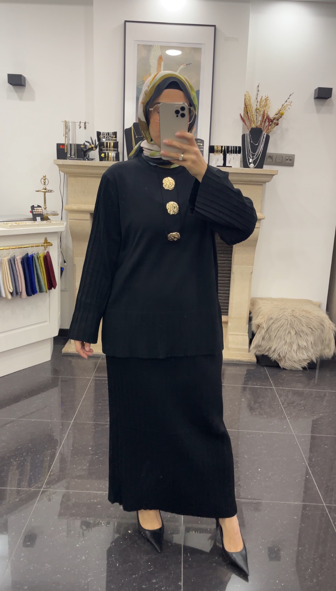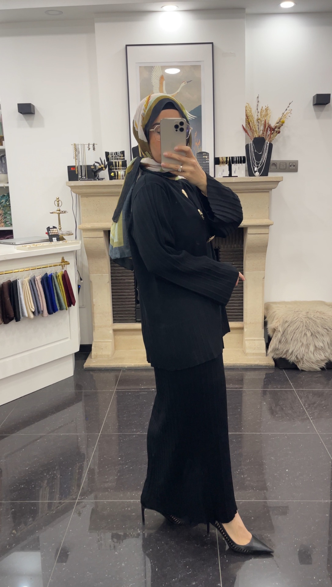 Ontdek de ultieme mix van stijl en comfort met onze mercerizé tricot twinset met plissérok en blouse met statement knopen en plissémouwen.