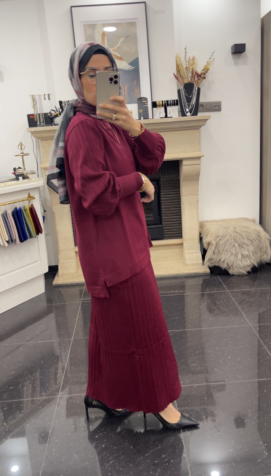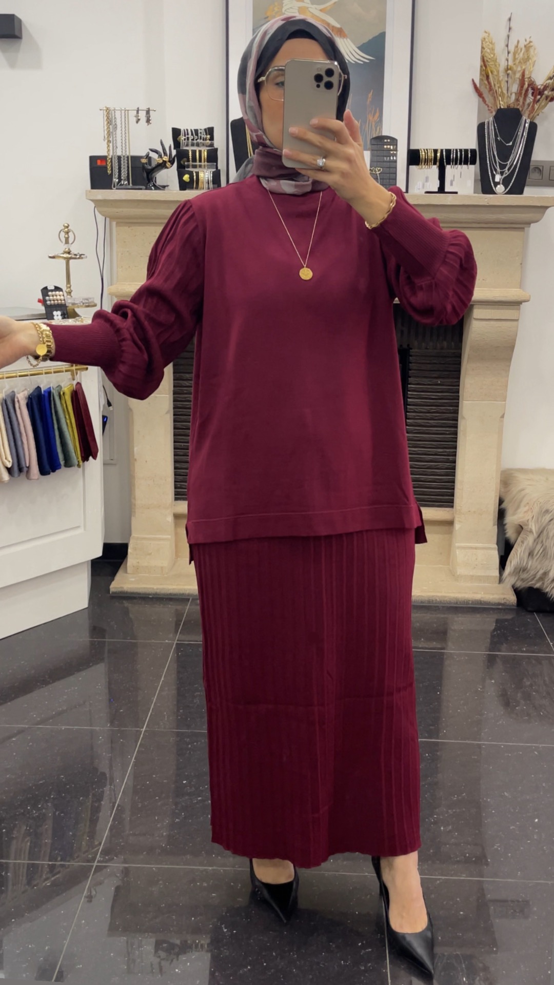 Ontdek de ultieme mix van stijl en comfort met onze merserizé tricot twinset met plissérok en blouse met plissémouwen in ballonmodel.