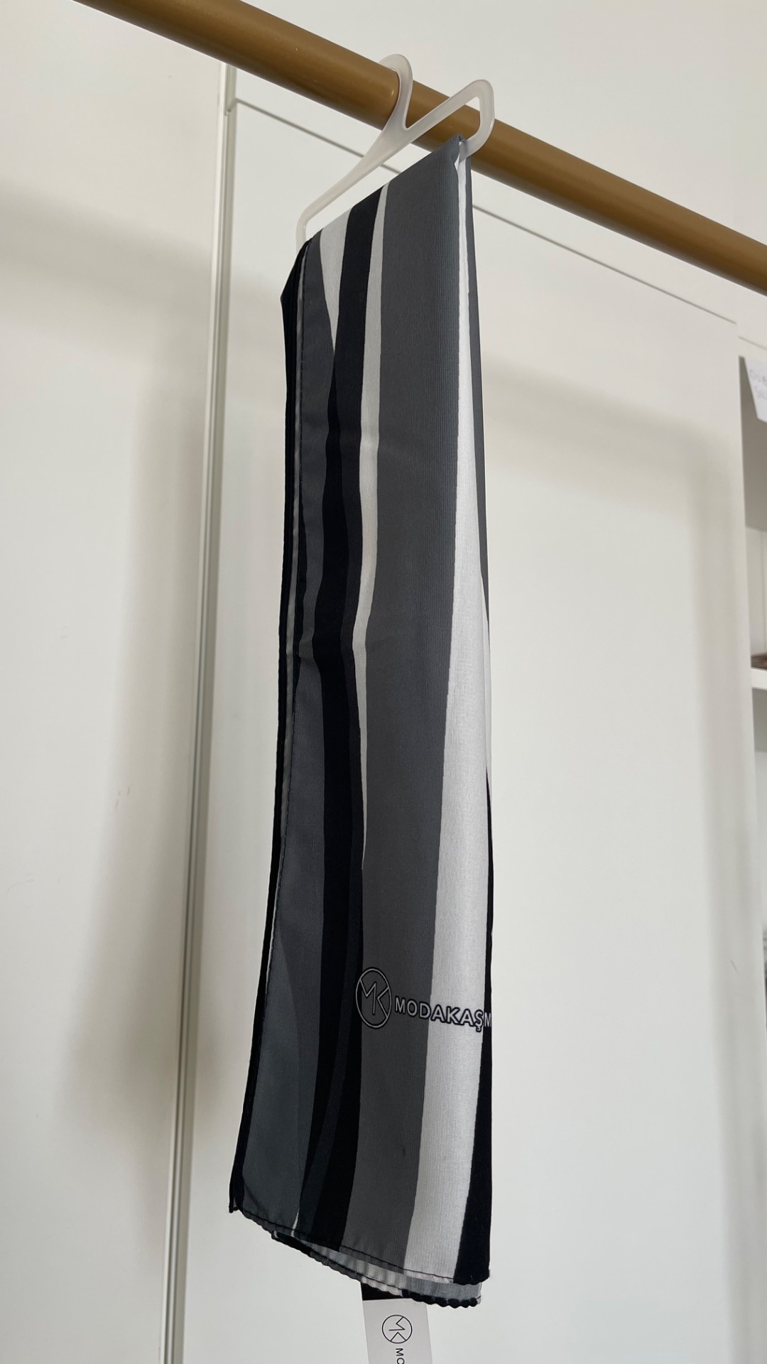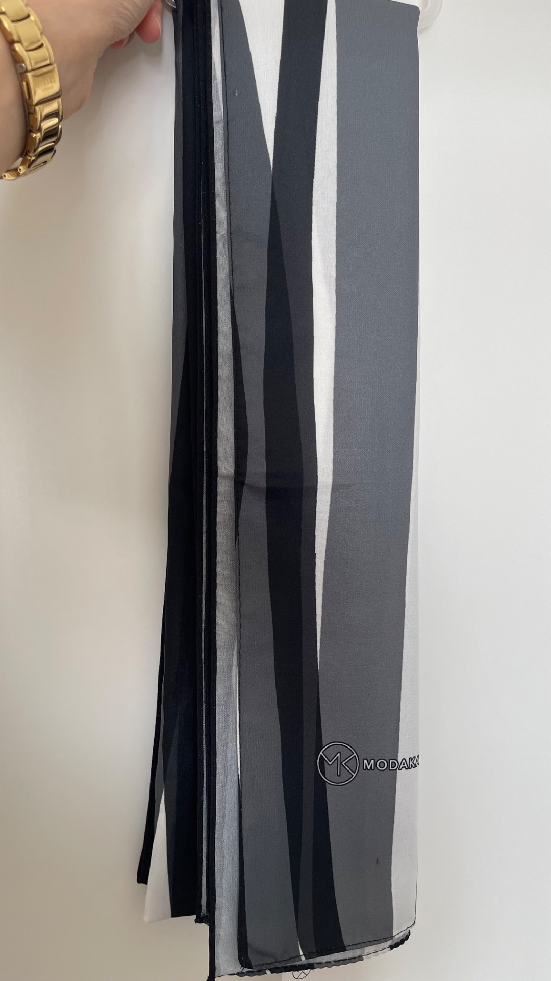Medina Silk Hijab Sjaal van het merk Modakaşmir met zwarte, grijze en witte golvenprint. Afmetingen: 180x70.
