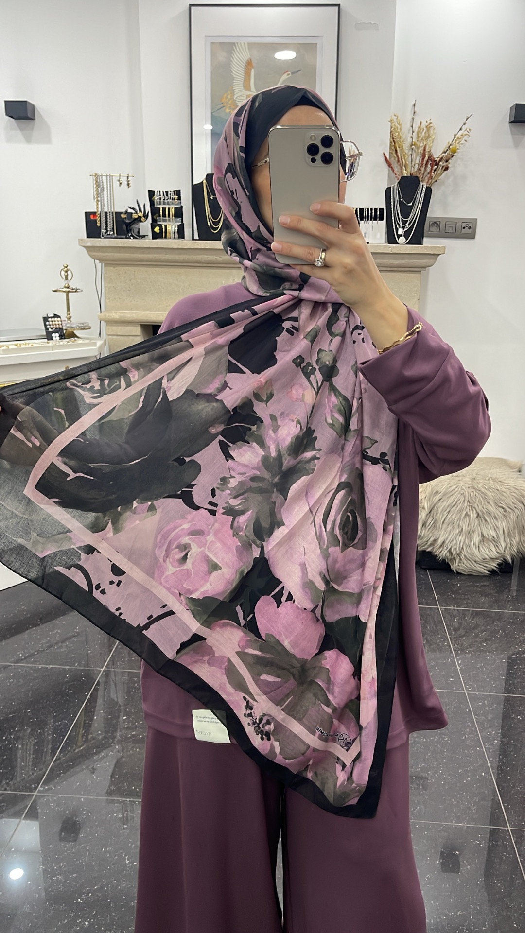 MODAKASMIR - Katoenen sjaal hoofddoek hijab met rozen en hortensia print pruim