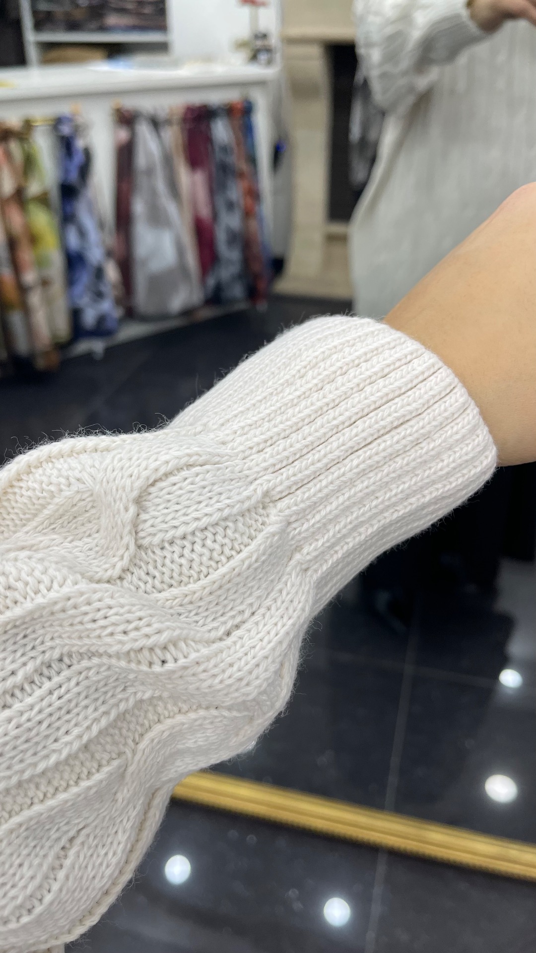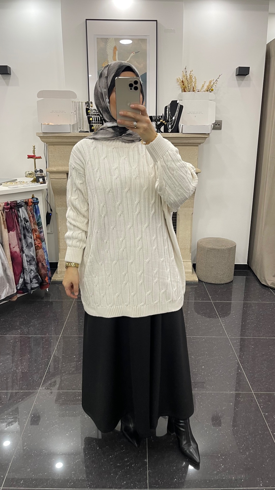 Lange warme kabeltrui. Perfect te combineren met broek of rok. One size past van 36 tot 46.