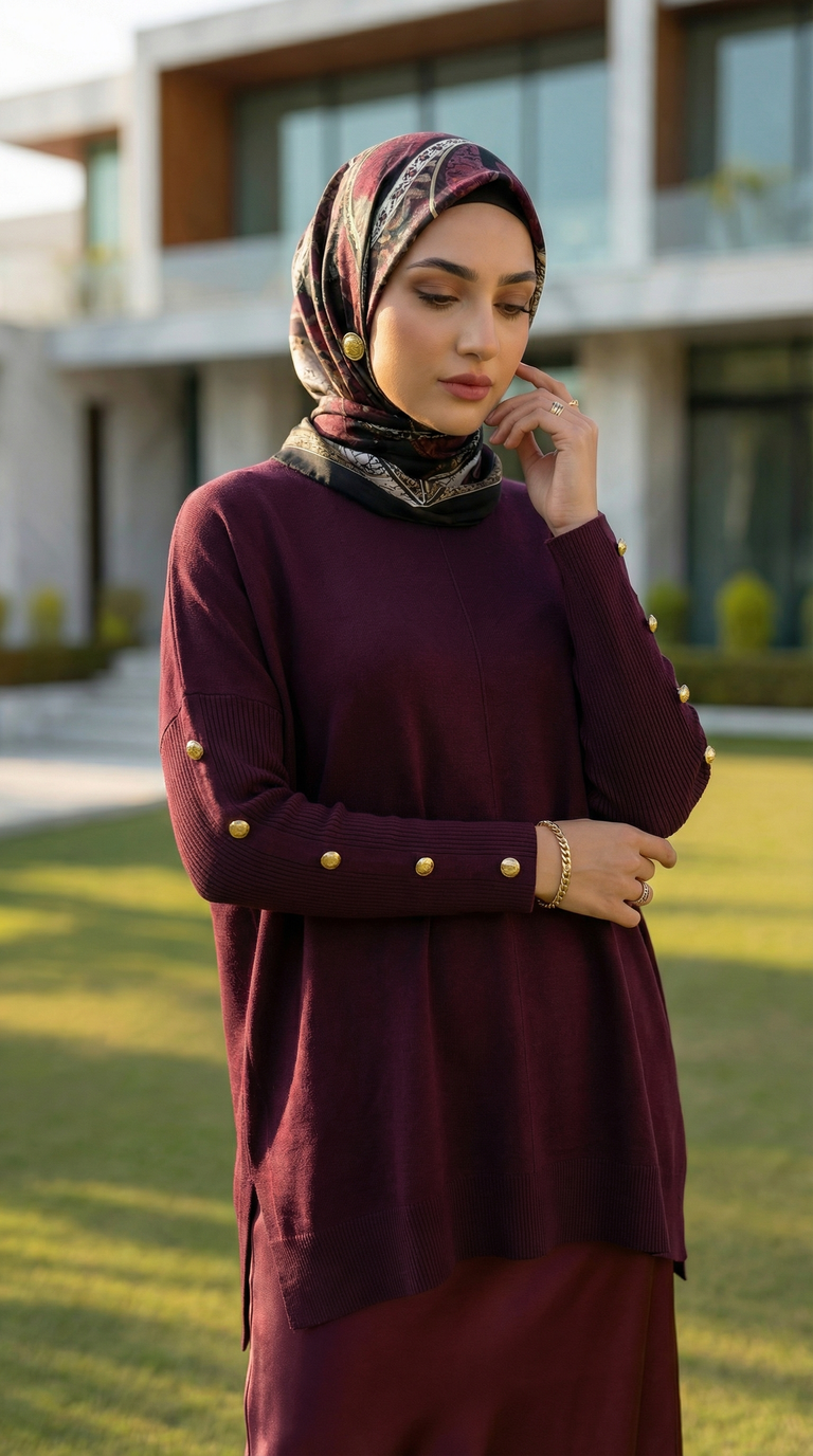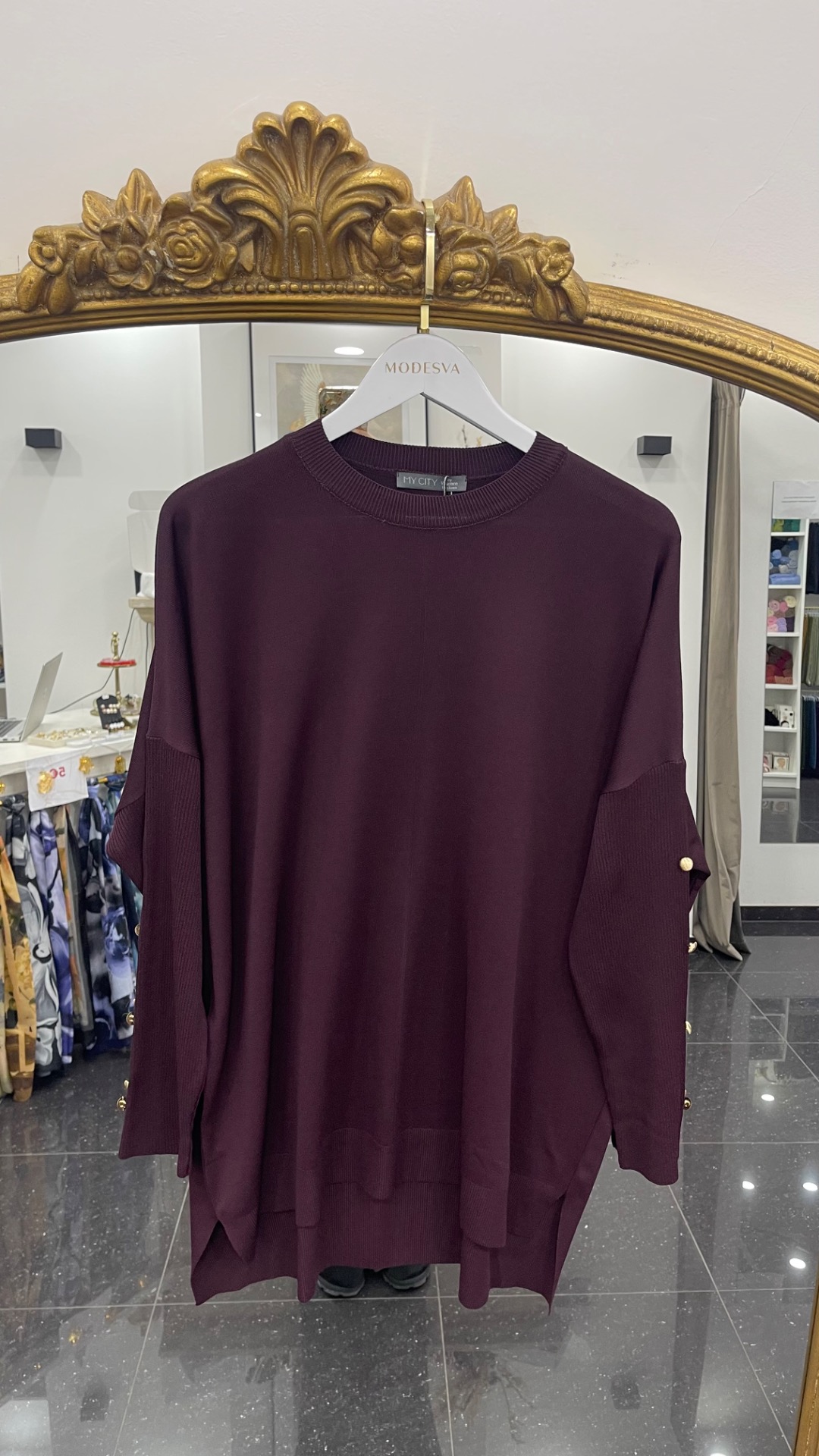 Mercerisé tricot oversized trui met goudkleurige knoopjes op de mouwen.