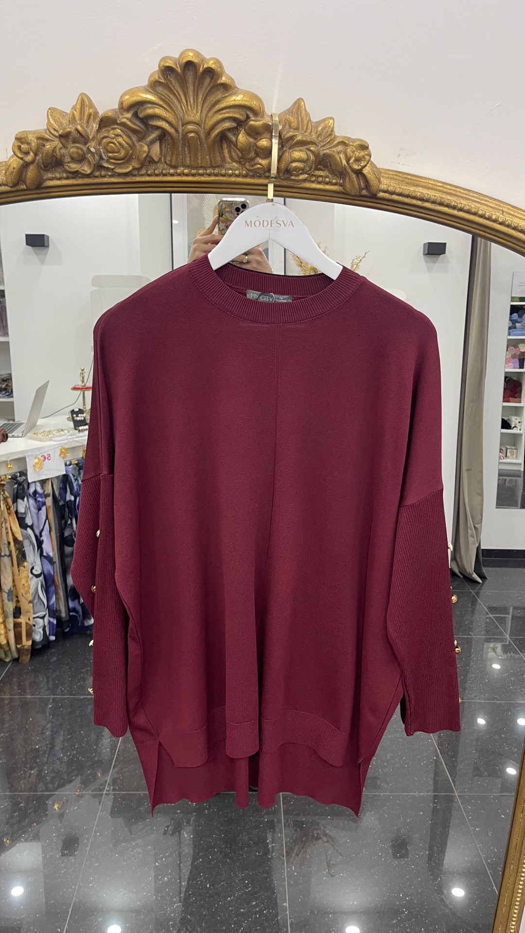 Mercerisé tricot oversized trui met goudkleurige knoopjes op de mouwen.