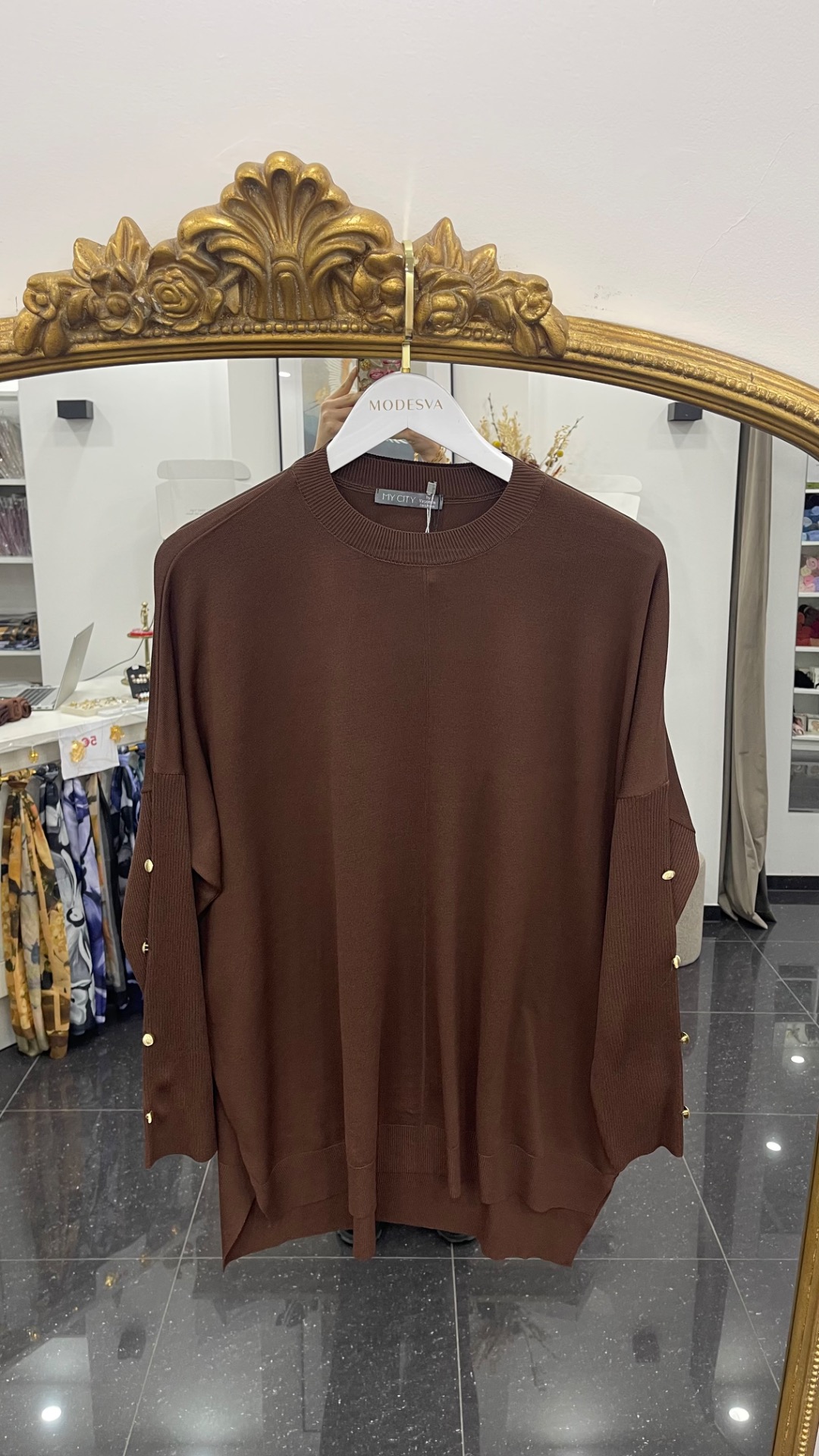 Mercerisé tricot oversized trui met goudkleurige knoopjes op de mouwen.
