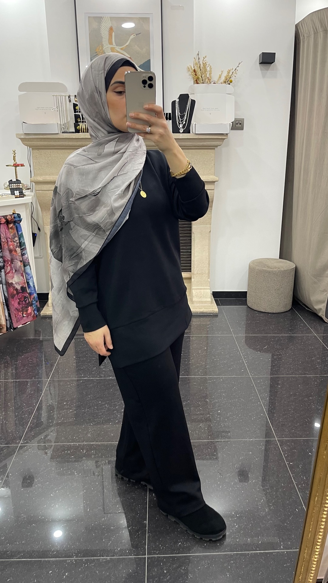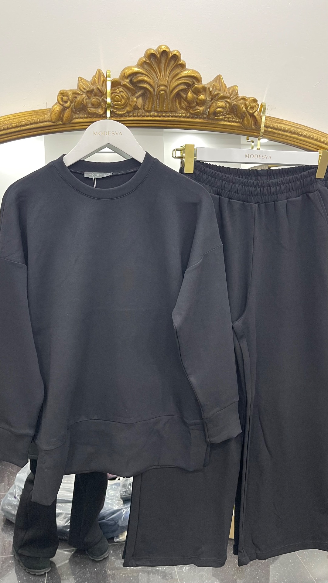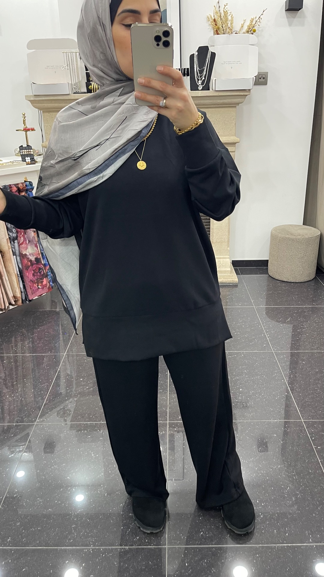 Deze prachtige twinset van zachte en luxe aanvoelende viscosemix is een musthave voor iedere garderobe. De basic trui met naad vanonder en aan de mouwen creëert een perfecte mix tussen sportief en casual. De broek heeft een elastische taille en zakken. De dikte van de stof is ideaal voor de seizoenovergangen en niet te dun voor de winter maar ook niet te dik voor de herfst en de lente. Een kwalitatief setje waar je jarenlang plezier aan zal hebben! De maten vallen normaal, maar als je wilt dat het wat losser zit kan je best de grote maat nemen.