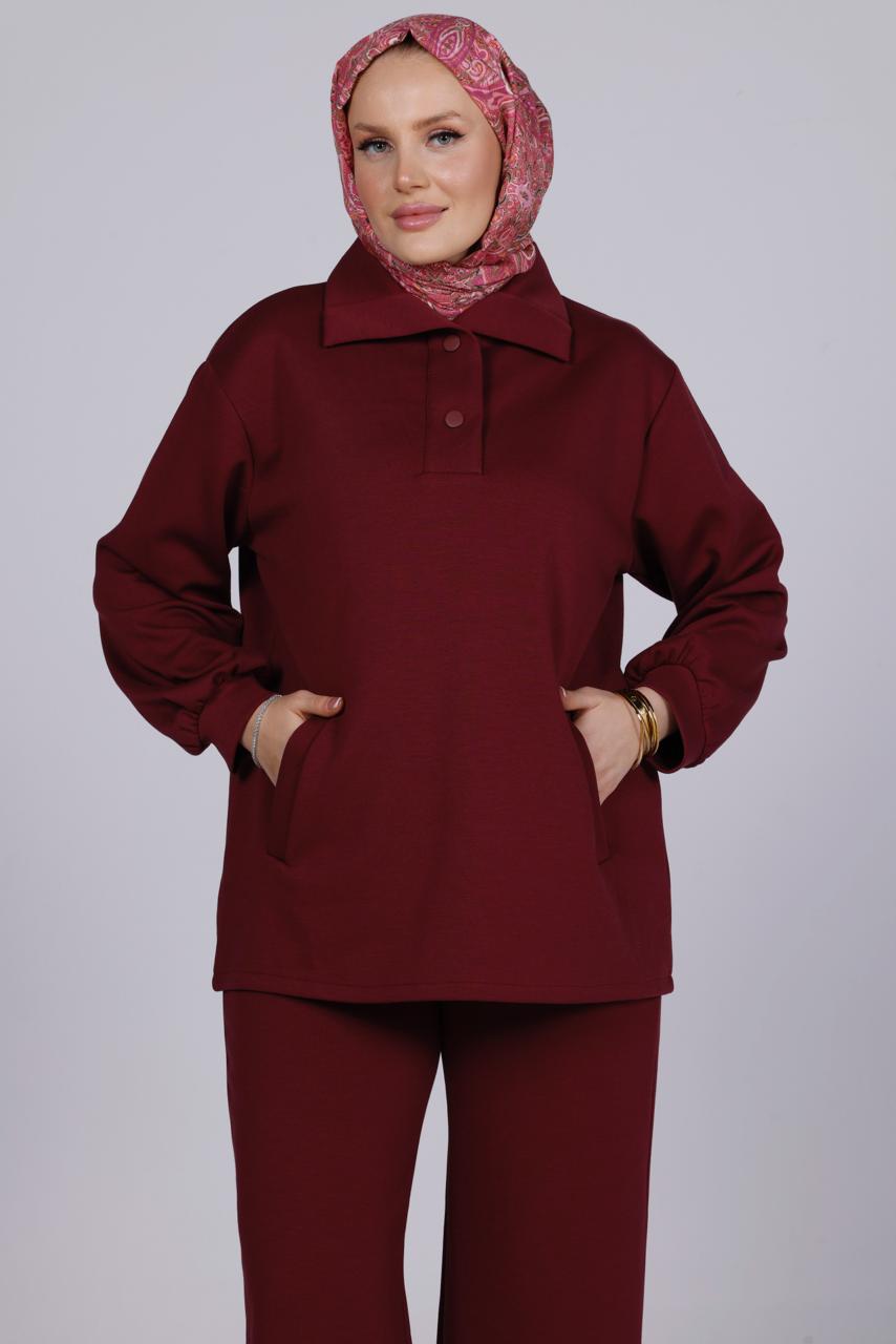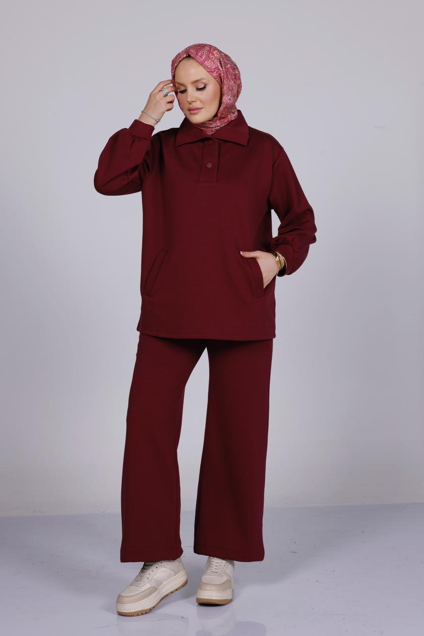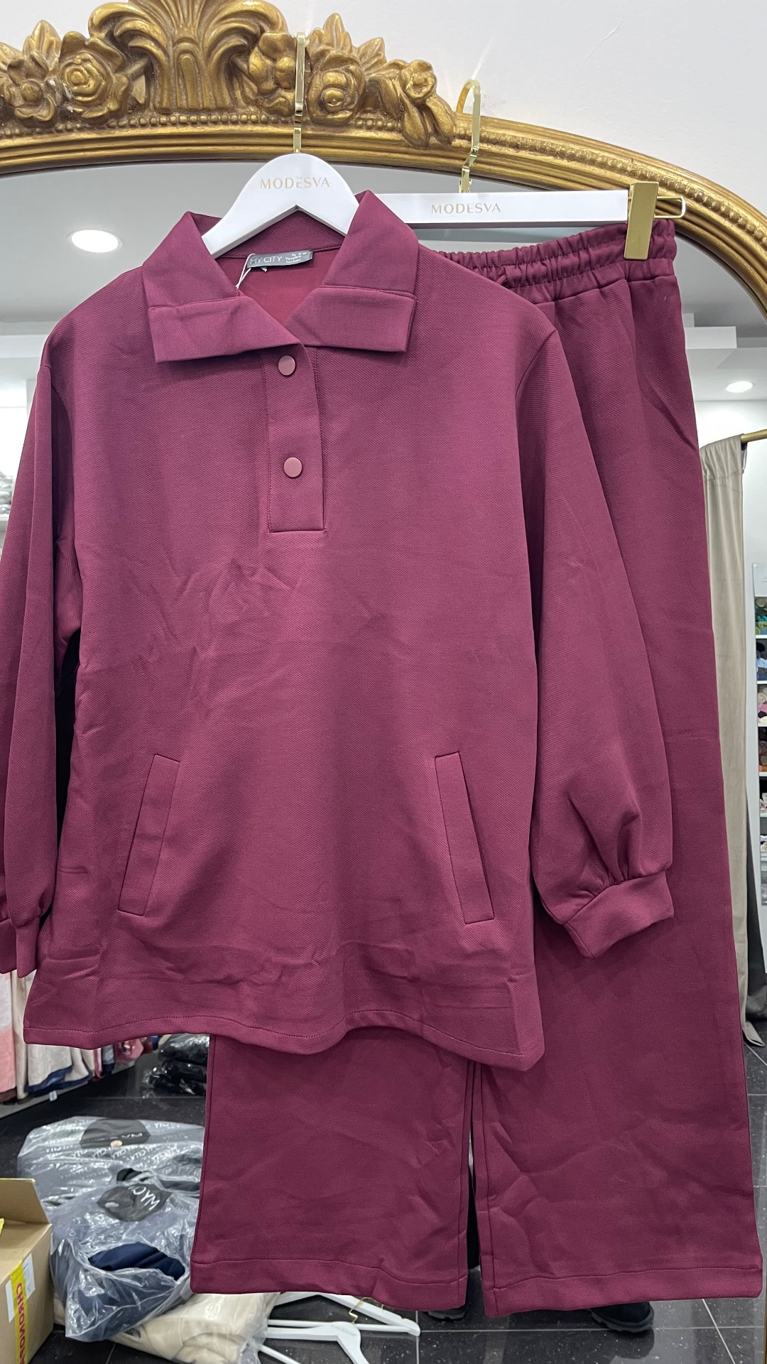 Deze prachtige twinset van warme katoenmix is een musthave voor iedere garderobe. De kraag met knoopjes creëert een coole look. De stof is ook elastisch samen met de elastische taille van de broek is deze set ook een en al comfort.