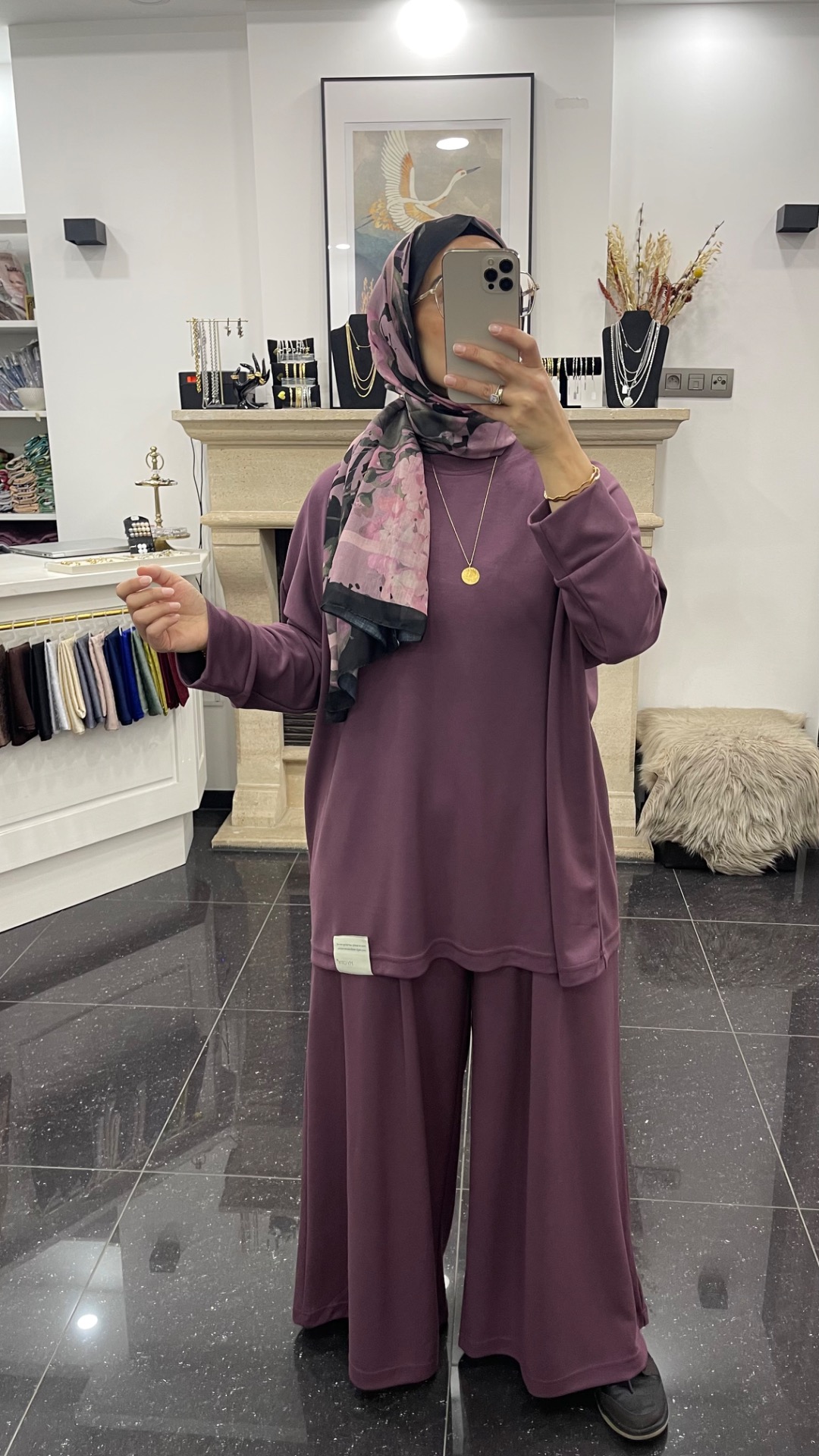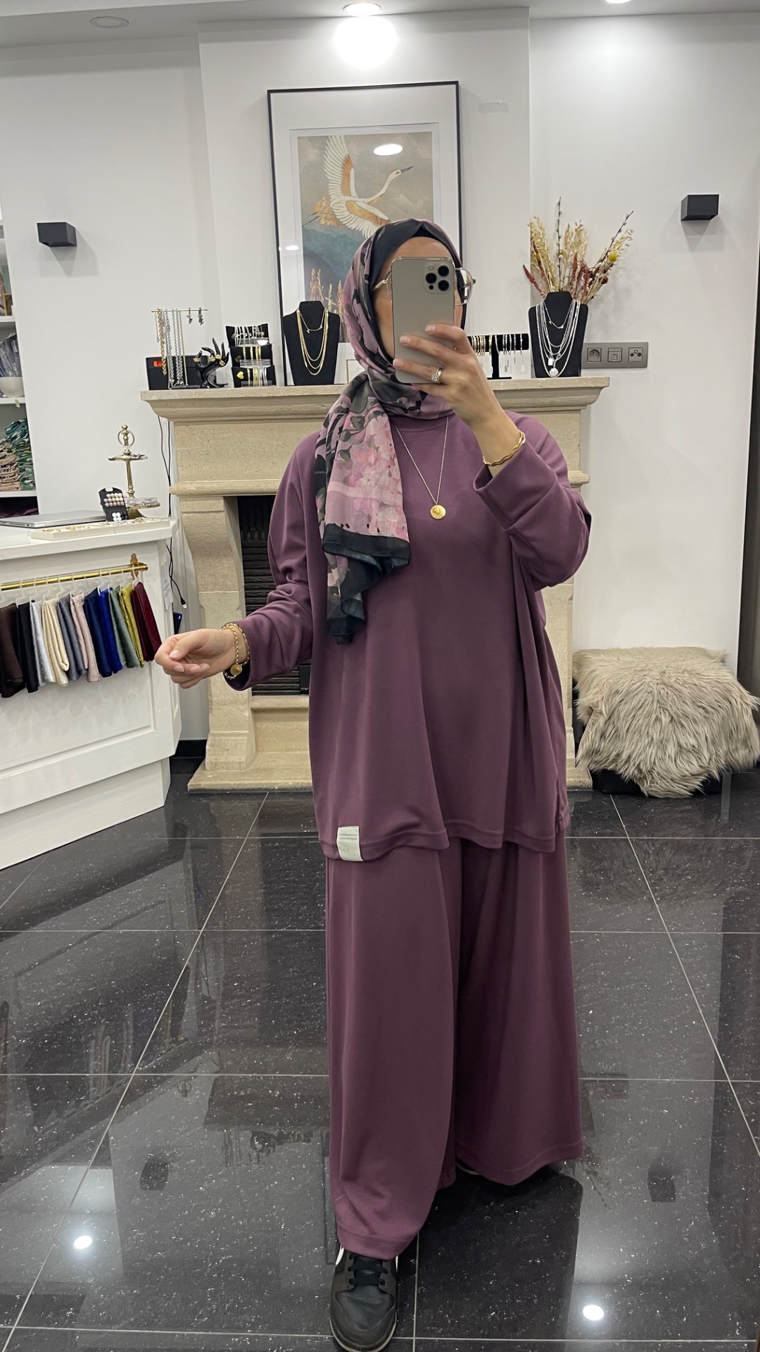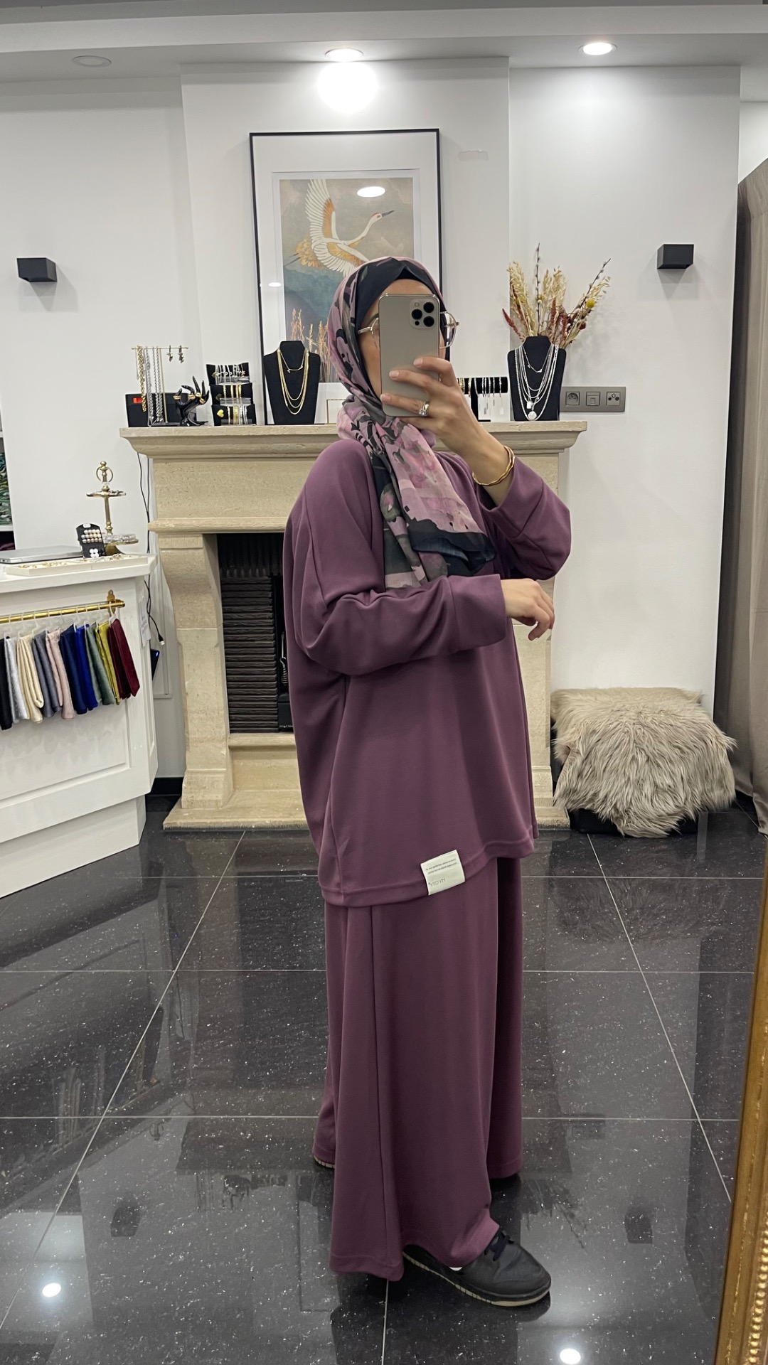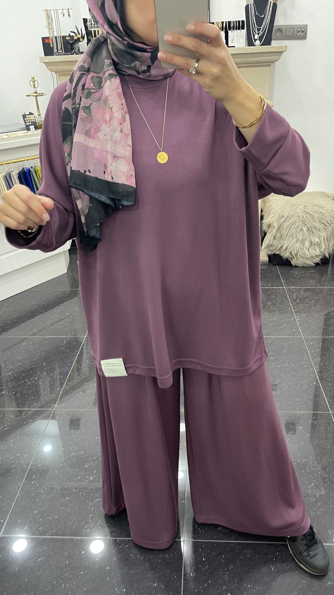 Twinset bestaande uit een brede broek en losse oversized blouse van zachte elastische stof van viscosemix.