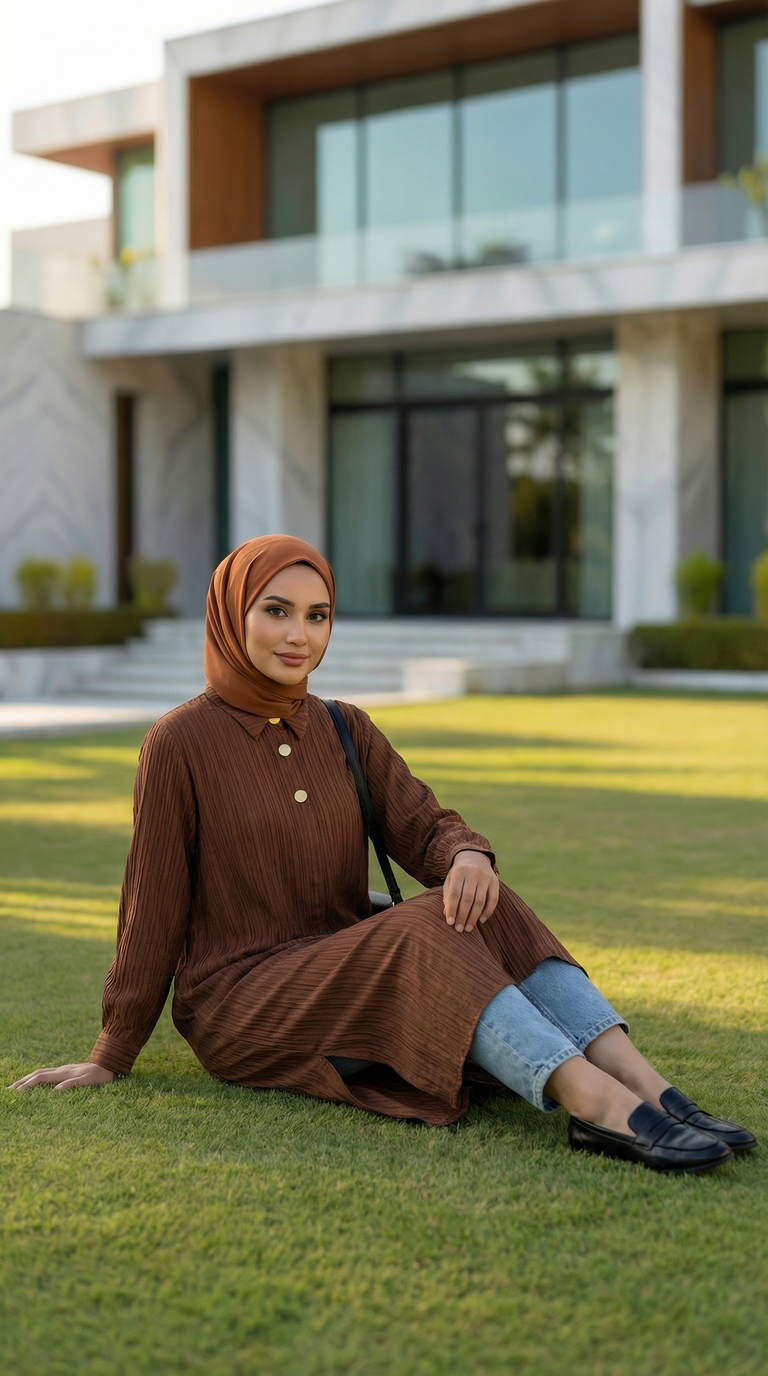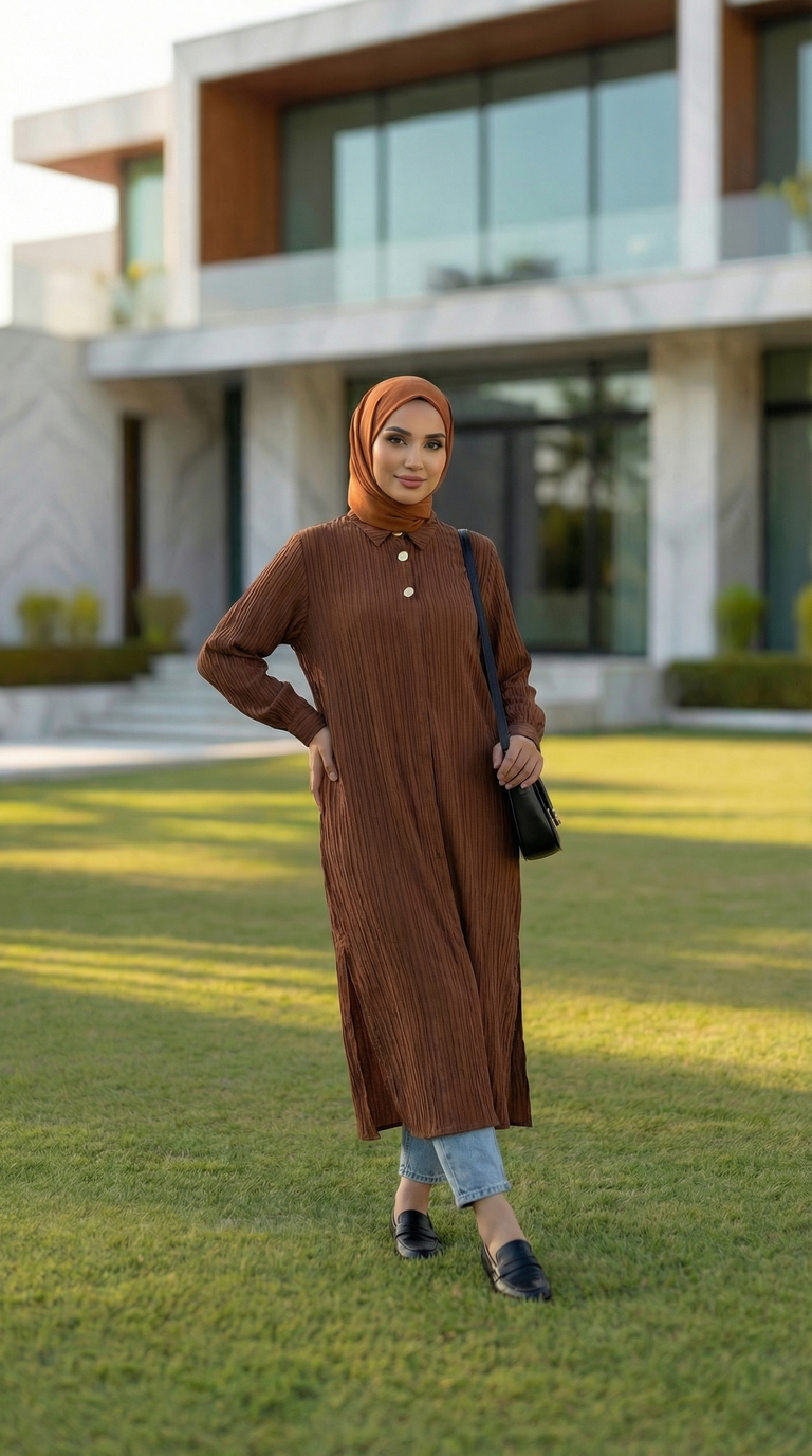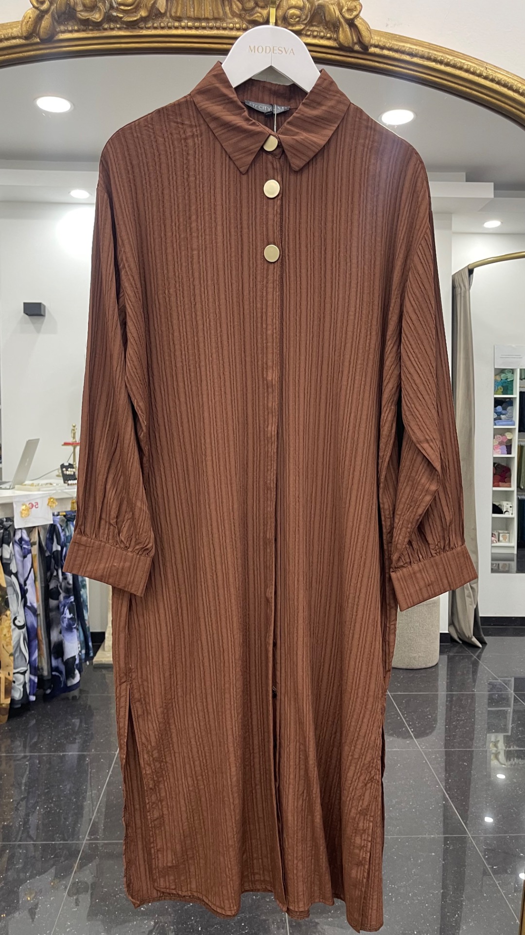 Extra lange tuniek van viscosemix met 3 goudkleurige knoopjes van de kraag tot de buste en verborgen knoopjes tot onder. De tuniek heeft splitjes aan de zijkanten en eentje van